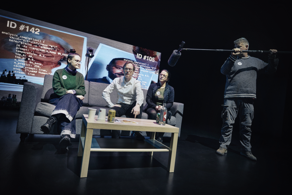Ved ankomst til salen udstyres vi alle med et publikumsnummer, og der bliver taget et billede af os. Allerede her begynder den kunstige intelligens at arbejde. Normalt skal man slukke telefonen, når man er i teatret, men til AI know you skal du derimod have den fremme, så vi kan svare på forestillingens mange spørgsmål, der bruges til at lære os at kende. Spørgsmålene er samtidig med til at finde ”dagens støj” – hvor mange svarer reelt på spørgsmålene.