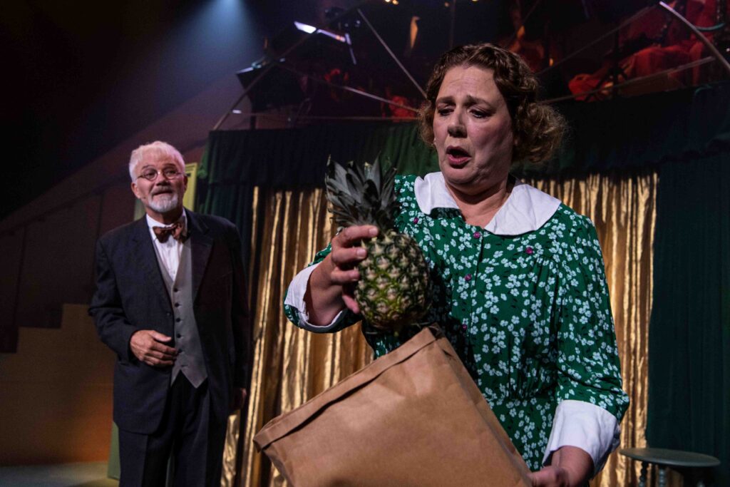Lader man blikket følge de to trapper langs begge sider af scenen, vil man øverst i midten møde det velspillende jazzorkesteret, under ledelse af Thomas Pakula, velplaceret i Camilla Bjørnvads scenografi. Scenografien er til den sparsomme side, men velplaceret og skaber en klarhed for de enkelte lokationer, og deres overgange, som vi befinder os i.
