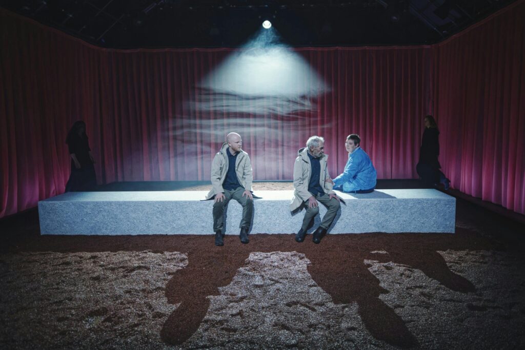 Scenografien af Katrine Krohns enkle scenografi, hvor pladen er fyldt med grus, som kun brydes af en stor stenbænk. Den kan både bruges til at sidde på, men den kan også fungere som en effektiv barriere, mens dramaets figurer står langt tæpperne, som omkranser scenen – nogle gange inden for som deltagere, nogen gange udenfor som tilskuere. Mod slutningen er der tæppefald – bogstavelig talt!