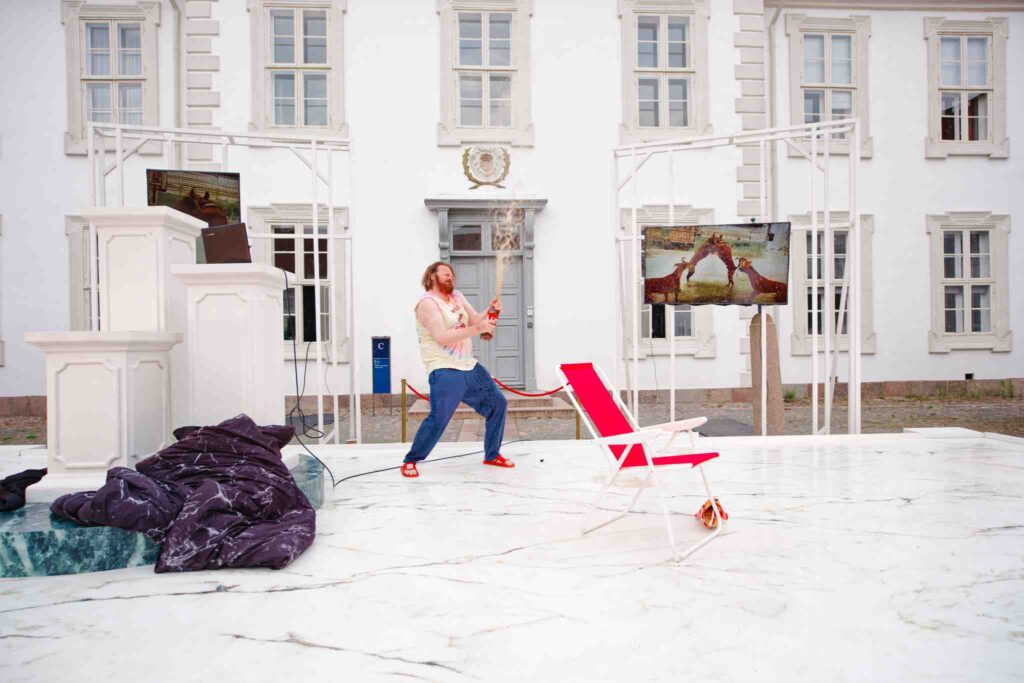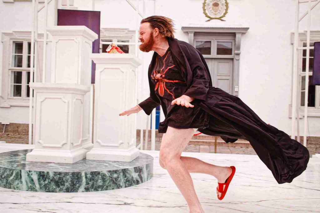 Scenografien af Freya Sif Hestnes forstærker denne dobbelte virkelighed på næsten hypnotisk vis. Scenegulvet er holdt i hvidt, marmorlignende materiale – sterilt, koldt og dødt, som et mausoleum for menneskelig kontakt. Ovenpå dette er en mørkegrøn, marmoreret platform hævet midt på scenen. Den virker som et isoleret podium, en sokkel, hvorpå det ødelagte ego iscenesætter sin ensomhed. Her står tre hvide søjler, klassiske og kølige, som om kældermennesket har placeret sig selv i et eget tempel, ikke for tilbedelse, men for dom. Hans egen dom over sig selv og verden.