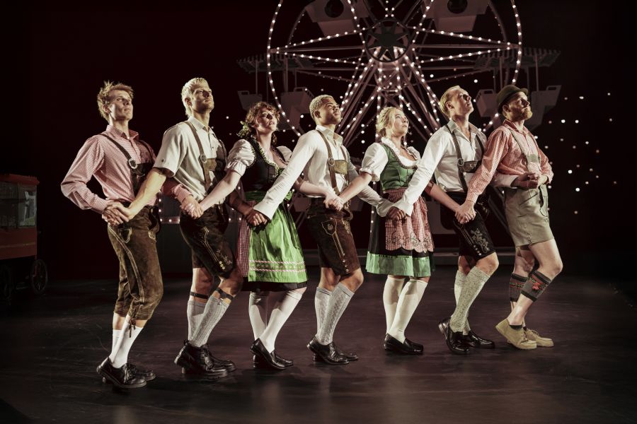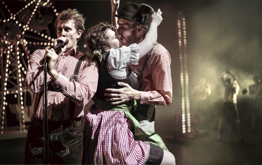 Anna Balslevs iscenesættelse falder i to dele, og den starter i en rendyrket Oktoberfeststil. Løwes kostumer er lederhosen og tyrolerkjoler, Rumle Sieling Langdal og Viktor Dahls musik er instrumentale og tyrolerficerede versioner af kendte sange som fx Robyns ”Dancing on My Own”, og Sebastian Kloborgs koreografier er skør og imponerende tyrolerdans.