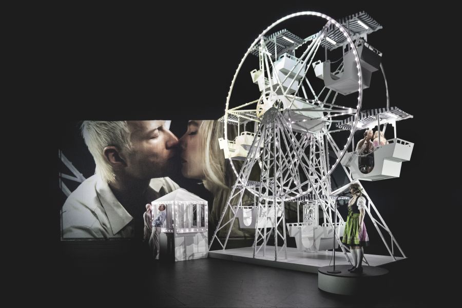 Tilbage står Mathias Bøgelunds Kasimir i sine lederhosen og kigger op på projektionen af Karoline og Schürzinger, der legende og kyssende filmer sig selv i pariserhjulet. Hvis man altså opdager ham.