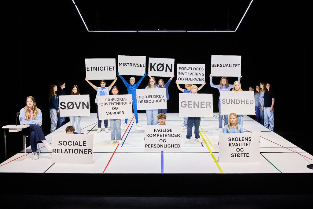Scenerummet på Aarhus Teaters mellemscene, Scala, er åbent. En stor hvid firkantet sceneforhøjning med striber på langs og tværs giver associationer til en gymnastiksal. Gulvet bliver både brugt flydende på tværs af stregerne, men også til at inddele børnene i alt fra indkomstgrupper til, på rigtig dramapædagogisk vurderingsøvelsesmanér, hvem der glad for at gå i skole eller føler sig ensomme. Forrest i venstre side, er en lille taburet placeret under et lille bord med en stor mikrofon. Børnene sætter sig her, når præsentere de hårde statistiske fakta. Sagt i et monotont sprog og i voksenformuleringer. En mikrofon på stativ, ofte placeret i højre side, men flyttes nemt rundt i rummet, giver børnene mulighed for at fortælle deres personlige fortælling om, hvordan de passer, eller ikke passer ind i statistikken. I udgangspunktet er ingen af børnene udstyret med mikrofoner udover dette.