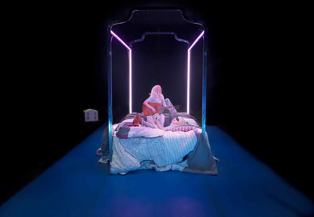 Publikum er placeret på tre sider rundt om hendes lille, rektangulære rum i Anna Hanghøjs simple scenografi, der minder om en ubehagelig himmelseng med en afgrund i midten. Her sidder Gry, spillet af Maria La Cour, og kravler rundt i puder og dyner, mens hun fortæller om sig selv. Hun præsenterer os for den indre stemme, den såkaldte ”sabotør”, der fortæller hende, at veninderne hellere vil være fri for hende, at hun er for dum til at komme i gymnasiet, og at hun er kedelig og kikset.
