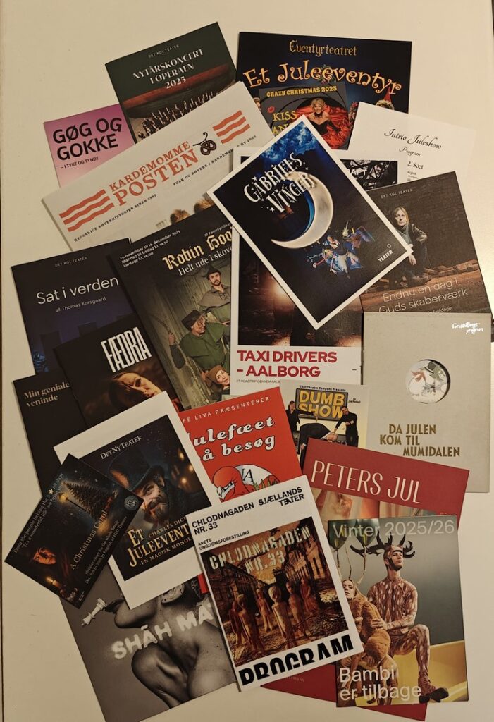 Vi har i 2025 set ca. 230 forestillinger. Listen dækker de forestillinger, som vi på den ene eller anden måde vil fremhæve. Listen er blot vores ”udpluk” – udover de nævnte forestillinger har der været en masse andet fantastisk teater rundt om i landet igennem hele året.